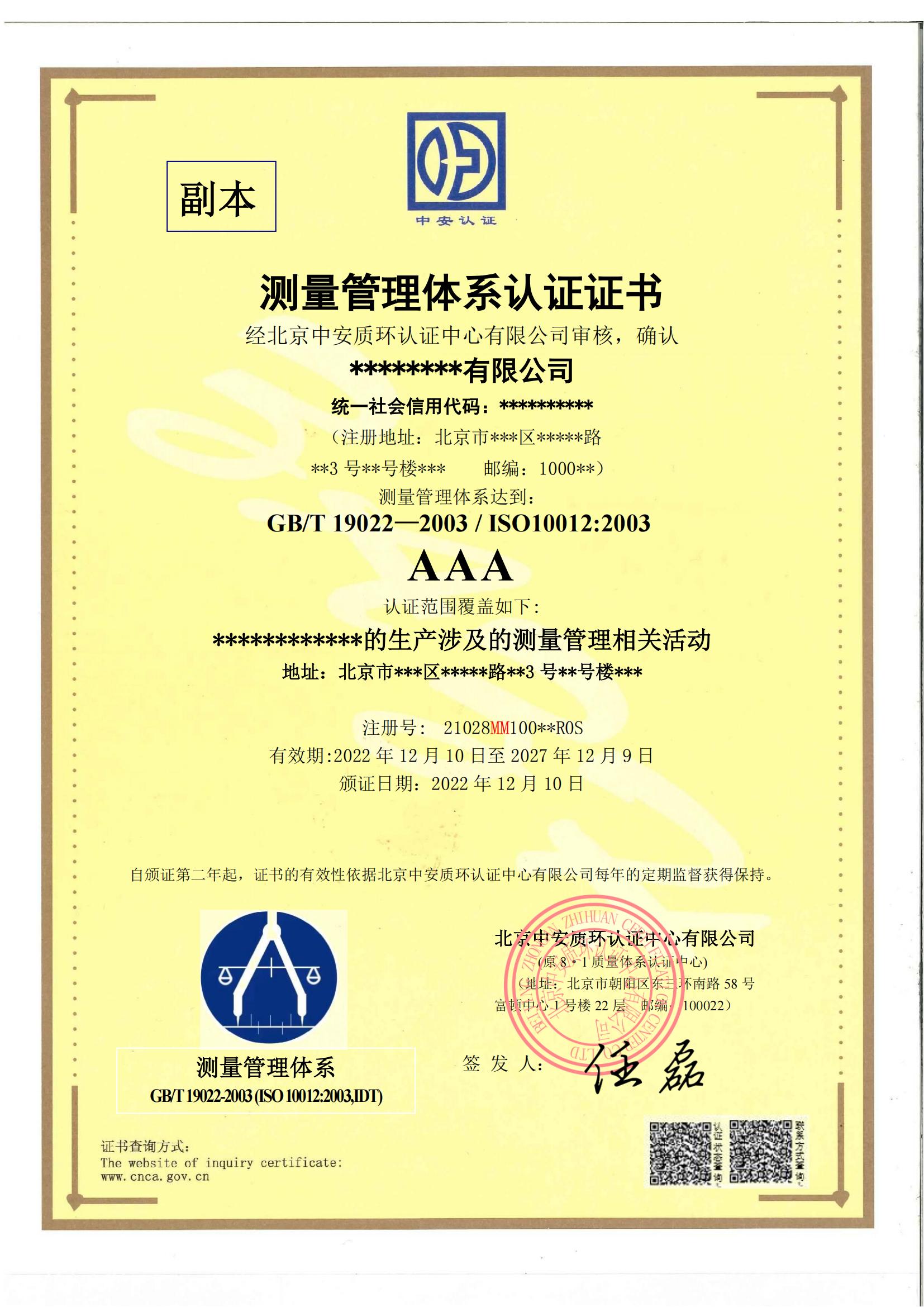 (1)AAA级证书:是对我国企业的测量管理体系能力的最高认可,,表明一个组织所运行的测量管理体系符合ISO10012测量管理体系标准的全部要求。。